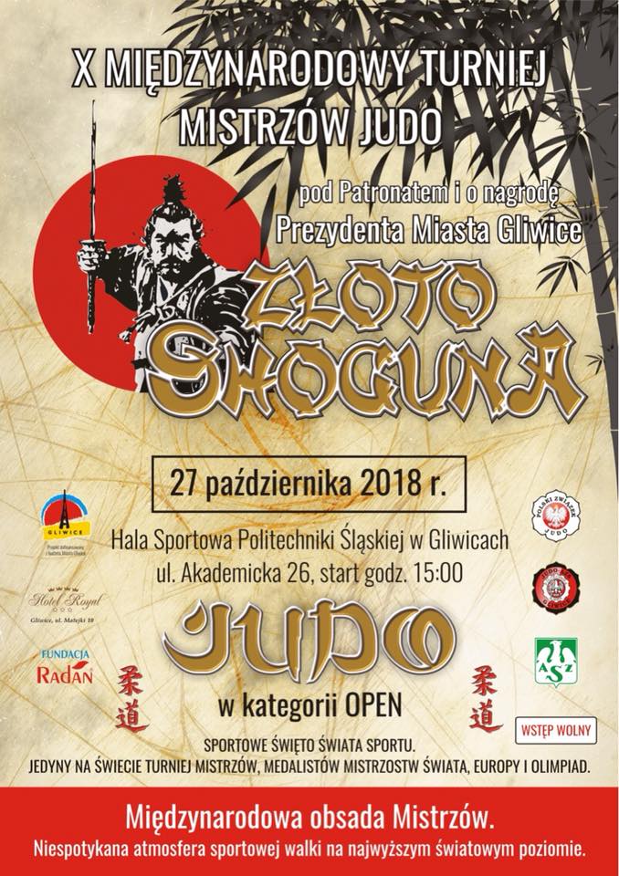 Organizatorzy zapraszają na coroczny tradycyjny Turniej Mistrzów o „Złoto Shoguna”. Zawody te objęte są patronatem Prezydenta Miasta i jak zwykle gwarantują walki na najwyższym światowym poziomie! Wystartują medaliści najważniejszych mistrzostw polskich, europejskich i światowych. Turniej ten odbędzie się w sobotę, 27 października w hali przy ul. Akademickiej 26 w Gliwicach. Start godz. 15.00.